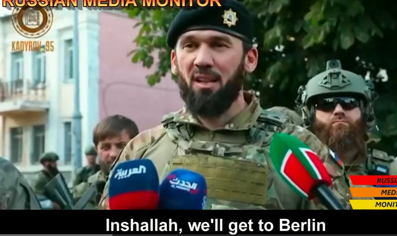 - „Inshallah, ar trebui să nu existe nicio îndoială, Republica Populară Donețk, Nikolaev, Herson, Odesa, până ne oprește Vladimir Vladimirovici Putin, Inshallah, vom ajunge la Berlin. Vom câștiga fără îndoială. Allahu Akbar! Președinte Vladimir Vladimirovici Putin, azi Ramzan Akhmativici Kadîrov, frații noștri apără Islamul, în primul rând. Apără valorile noastre. Apără măreția Atotputernicului. Ramzan Kadîrov, șeful Ceceniei, joacă un rol important în acest jihad și toți comandanții noștri aflați sub comanda sa. În primul rând, aceasta este despre credința în Atotputernicul. Este despre valorile noastre spirituale și limba noastră. Inshallah, ar trebui să nu existe îndoială”, a spus el într-un video.