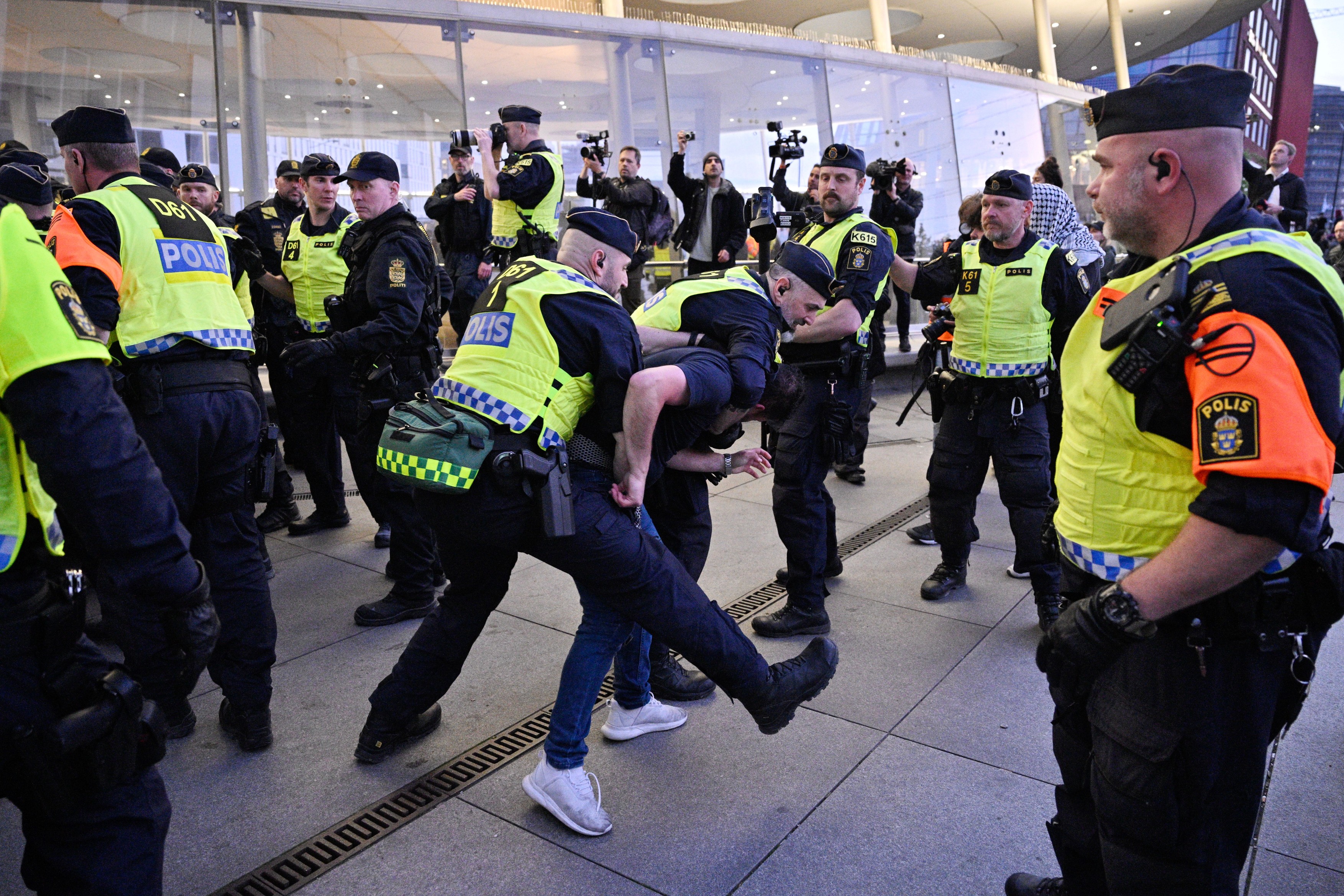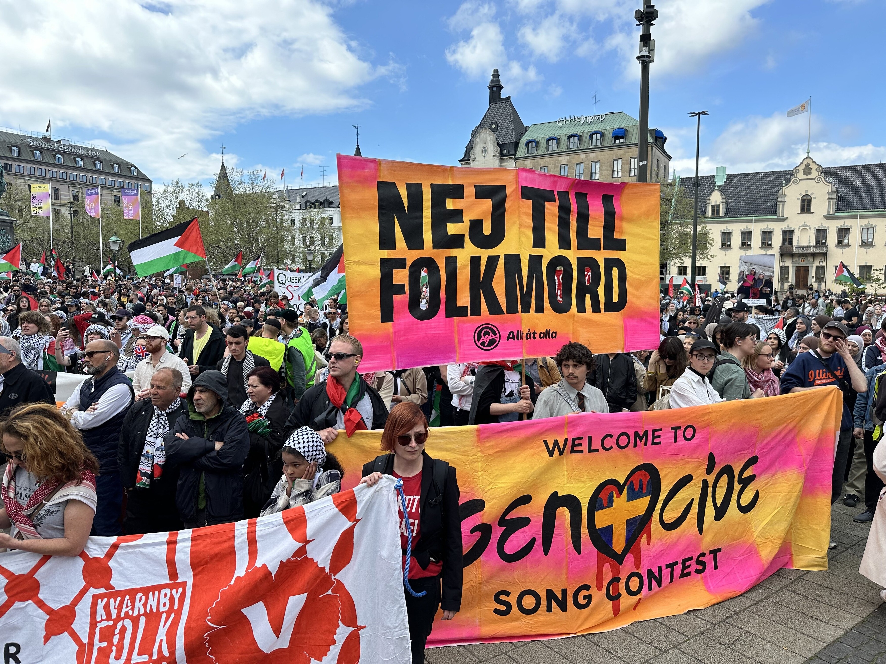 O mulțime de protestatari s-a adunat în piața centrală a orașului gazdă din Suedia înainte de a mărșălui spre locul în care se desfășoară concursul, fluturând steaguri palestiniene și strigând „Eurovision uniți de genocid” – o răsturnare a sloganului oficial al concursului „Uniți prin muzică”.