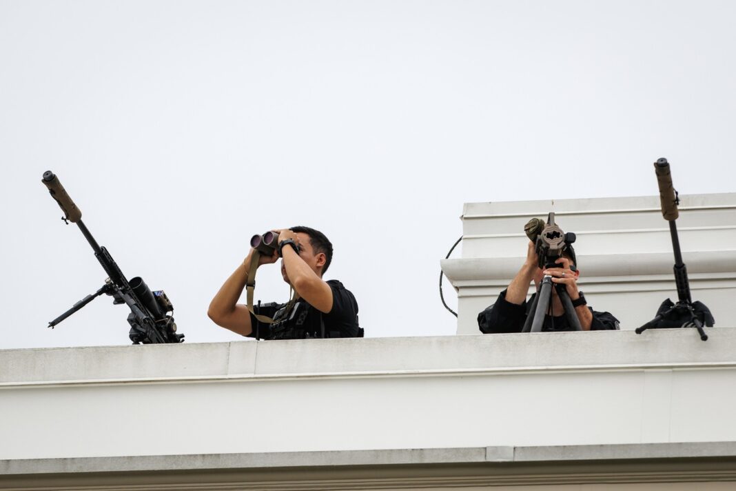 Lunetiști ai Secret Service, surprinși înainte ca președintele SUA, Donald Trump, să se plimbe pe acoperișul aripii vestice a Casei Albe, pe 5 august 2025, în Washington, D.C.