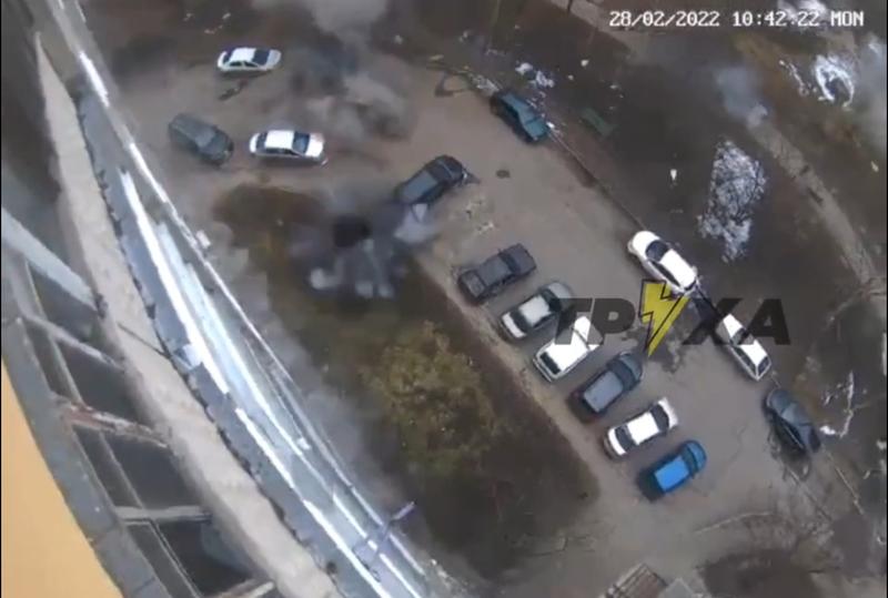 Imagini noi publicate pe rețelele sociale arată cum loviturile de artilerie lovesc aparent fără o țintă exactă, ci la nimereală într-un bloc de locuințe și în parcarea de lângă clădire, în timp ce pe trotuare oamenii surprinși de foc fug care-ncotro.