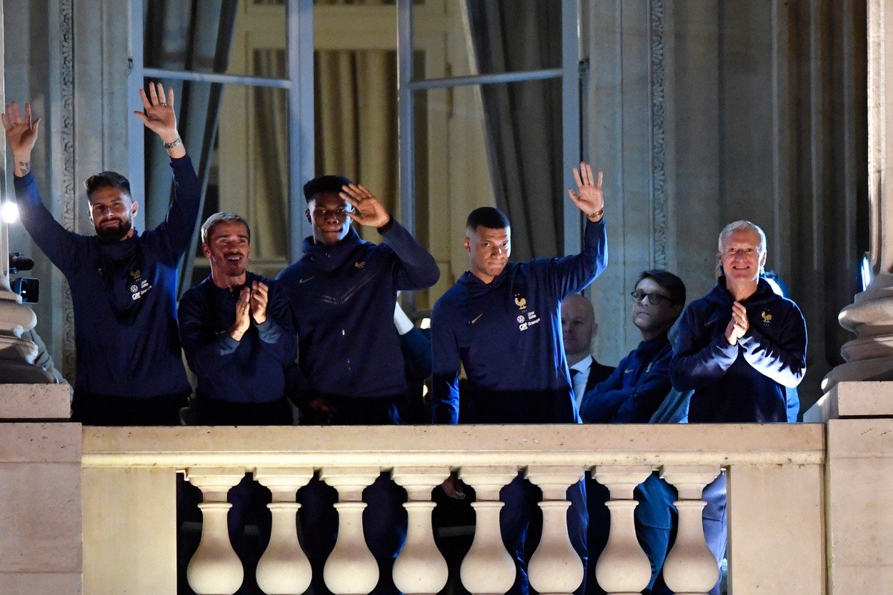 Selecţionerul Didier Deschamps şi căpitanul Hugo Lloris au fost primii care au ieşit pe balcon, fiind urmaţi de Benjamin Pavard, Axel Disasi şi Raphaël Varane. Kylian Mbappe a fost aclamat de mulţimea prezentă.