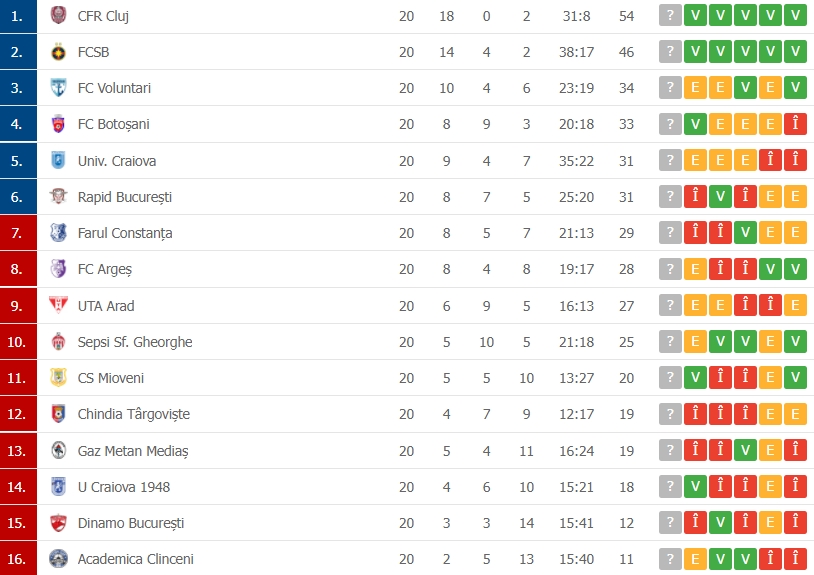 CFR Cluj este lider în clasament, cu 54 de puncte, în timp ce echipa de pe locul doi, FCSB, are 46 de puncte. Farul ocupă locul 7, cu 29 de puncte.