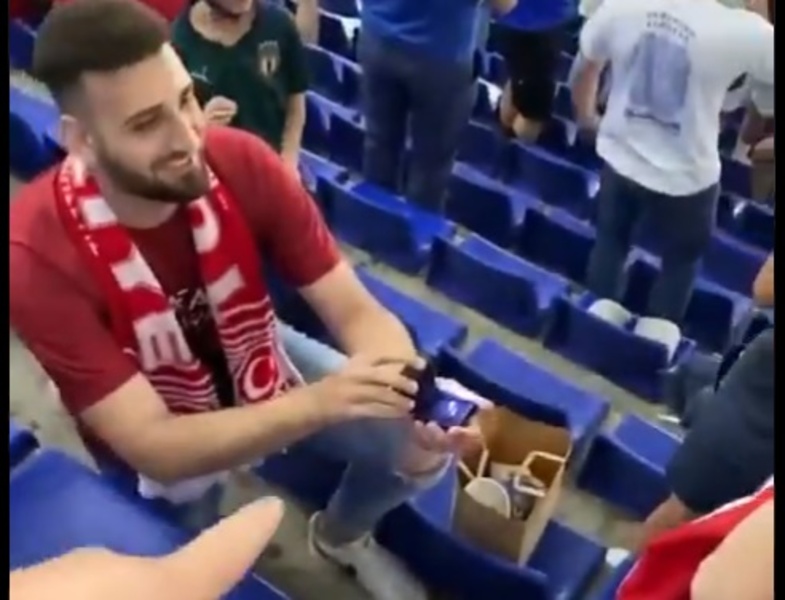 La partida de debut a Euro 2020, Turcia – Italia, un fan turc s-a pus în genunchi și și-a cerut partenera în căsătorie, chiar în tribunele stadionului Olimpico.