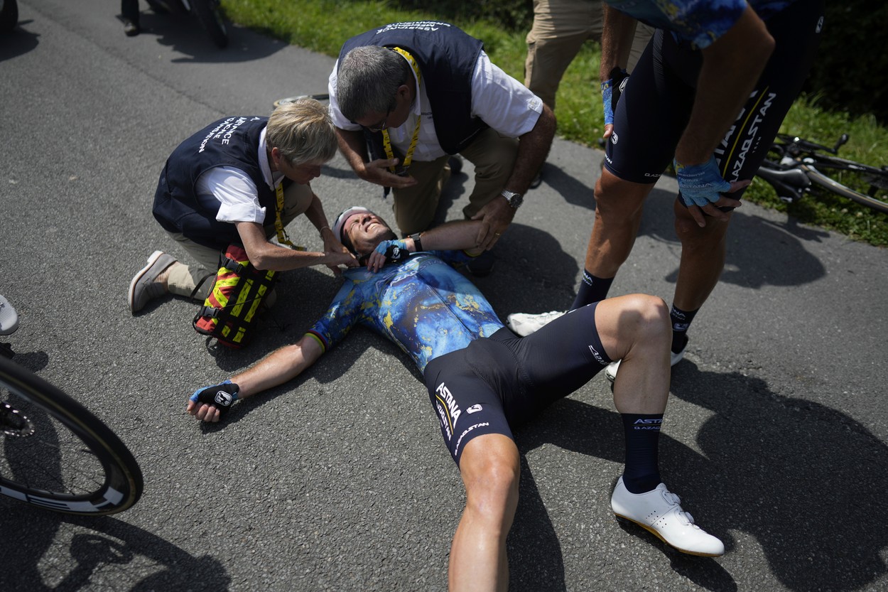 The Astana Qazaqstan clutches his shoulder as he attempts to get up uD83DuDE2C#TDF2023 pic.twitter.com/jVkourXABk
