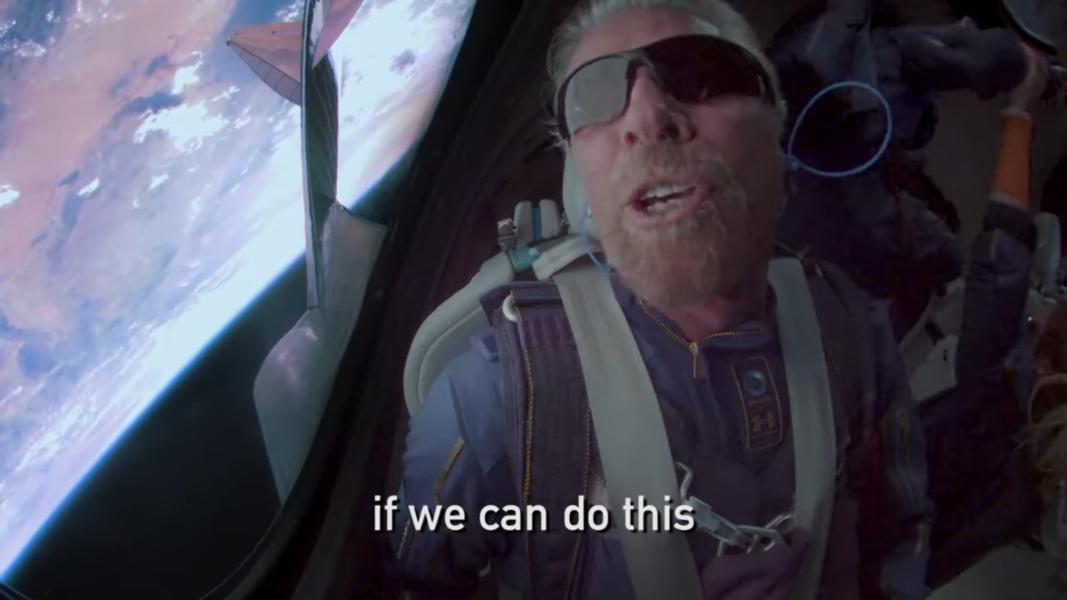 De la circa 86 de kilometri altitudine, acolo unde granița atmosferei terestre și cea a spațiului cosmic se întrepătrund, miliardarul Richard Branson la bordul navetei dezvoltate de compania sa Virgin Galactic, a ținut să transmită un mesaj simbolic, înainte de a se elibera din scaun și pluti prin cabină în condiții de imponderabilitate.