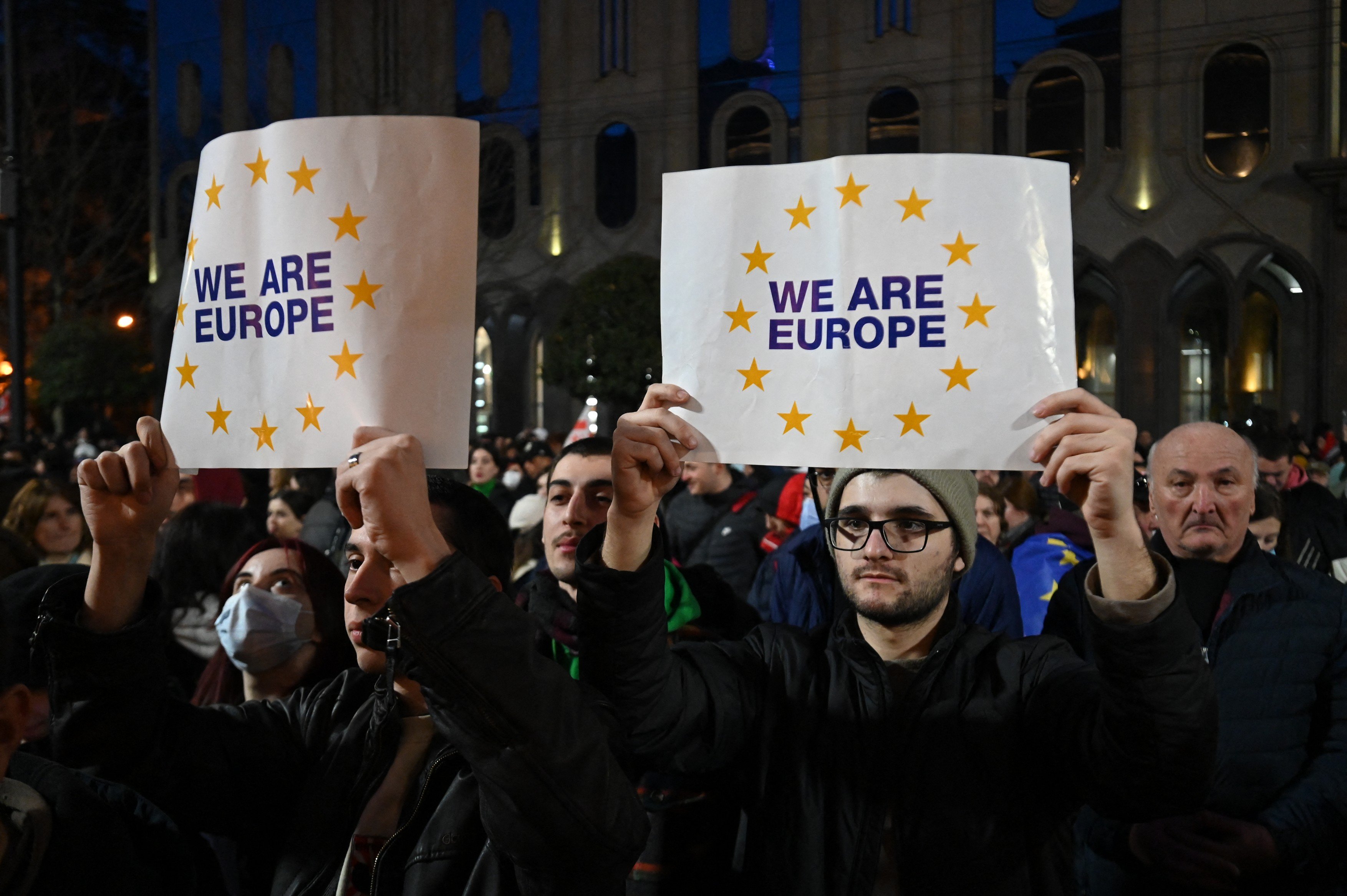 Reporterii Reuters au auzit cum mulțimea cânta sau difuza imnuri georgiene, ucrainene și ale Uniunii Europene, în timp ce oamenii au blocat traficul din fața parlamentului.