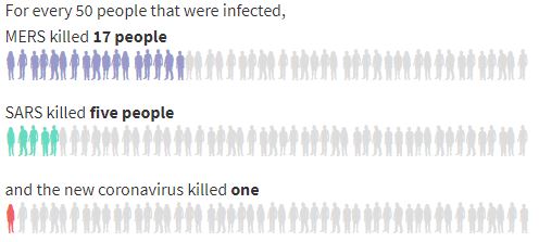 Statisticile furnizate de China sugerează că noul virus, deși este mult mai contagios decăt SARS, este semnificativ mai puțin letal.