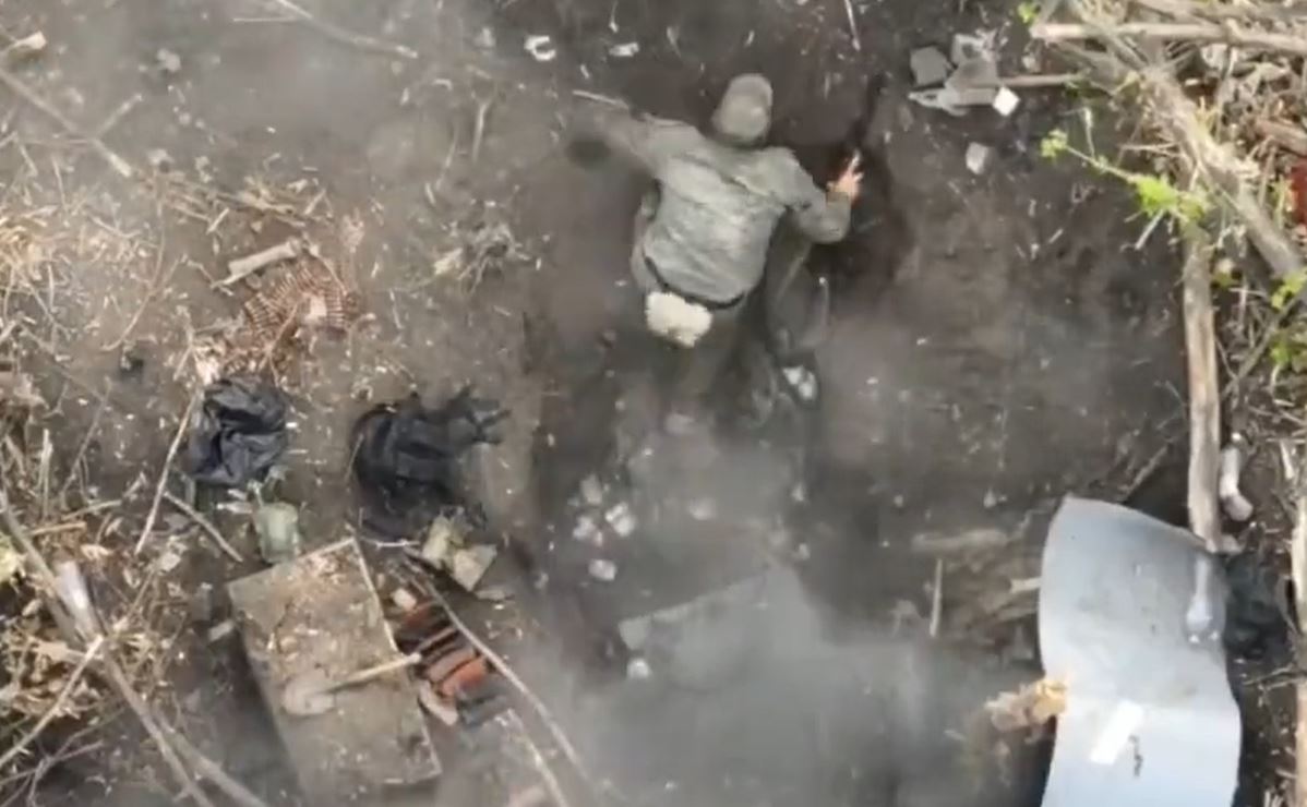 În imaginile filmate chiar de drona ucraineană, se vede cum aceasta dă drumul unei grenade către tranșeea unde se odihnea soldatul rus.