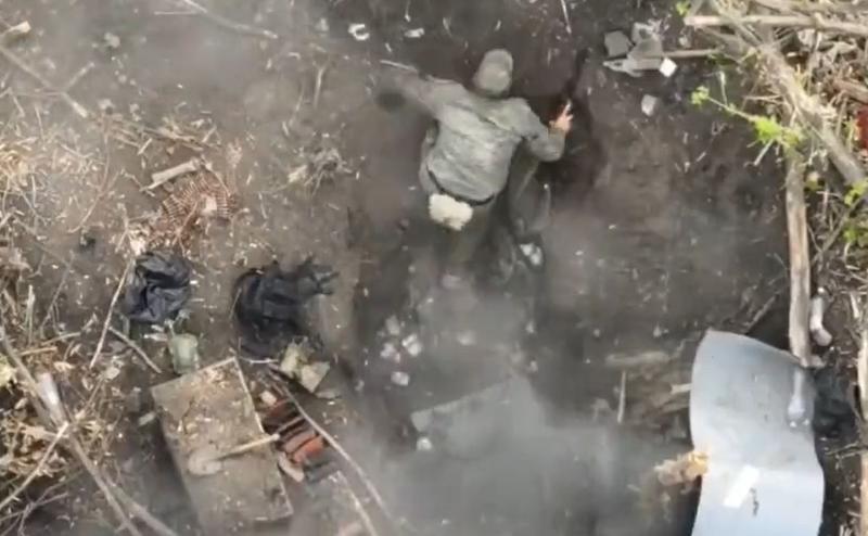 În continuare, se observă cum proiectilul cade spre victima luată la țintă de operatorul ucrainean al dronei, dar aterizează într-o mică adâncitură laterală a tranșeei.