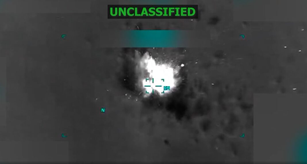 O înregistrare video de aproximativ 30 de secunde, marcată drept „desecretizată”, postată de Trump alături de mesaj, pare să arate o navă staționară într-un corp de apă care este lovită de un proiectil, pentru ca apoi să explodeze.