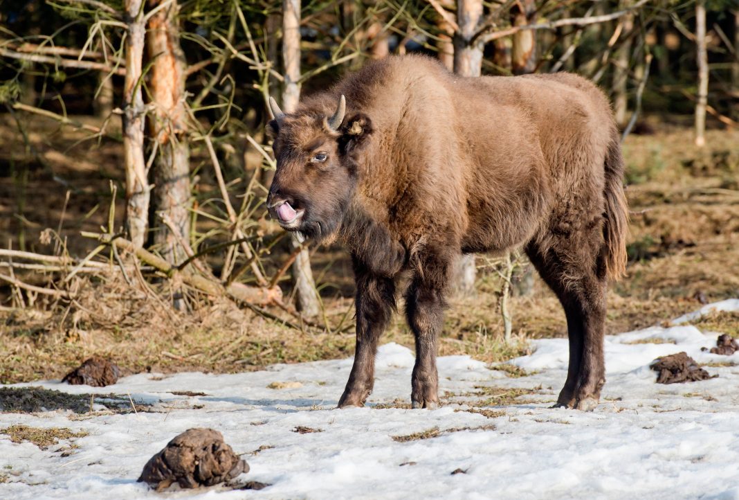 În imagini se mai observă cum zimbrul pare că ar căuta de mâncare şi este atras de zonele de vegetaţie care nu fuseseră acoperite în întregime de zăpadă.