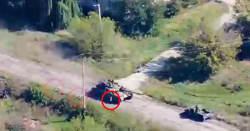 La un moment dat, pe filmare se vede că cei din tanc ar putea avea motive întemeiate de panică. Mai exact, trece chiar pe lângă un soldat ucrainean (potrivit celui care a postat clipul), iar acesta pare să aibă un lansator portabil.