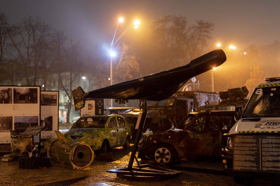 O dronă de tip Shahed (Geran-2 de fabricație rusă), expusă alături de tancuri și echipamente rusești distruse în piața Mykhailivska din Kiev, pe 20 noiembrie 2025.