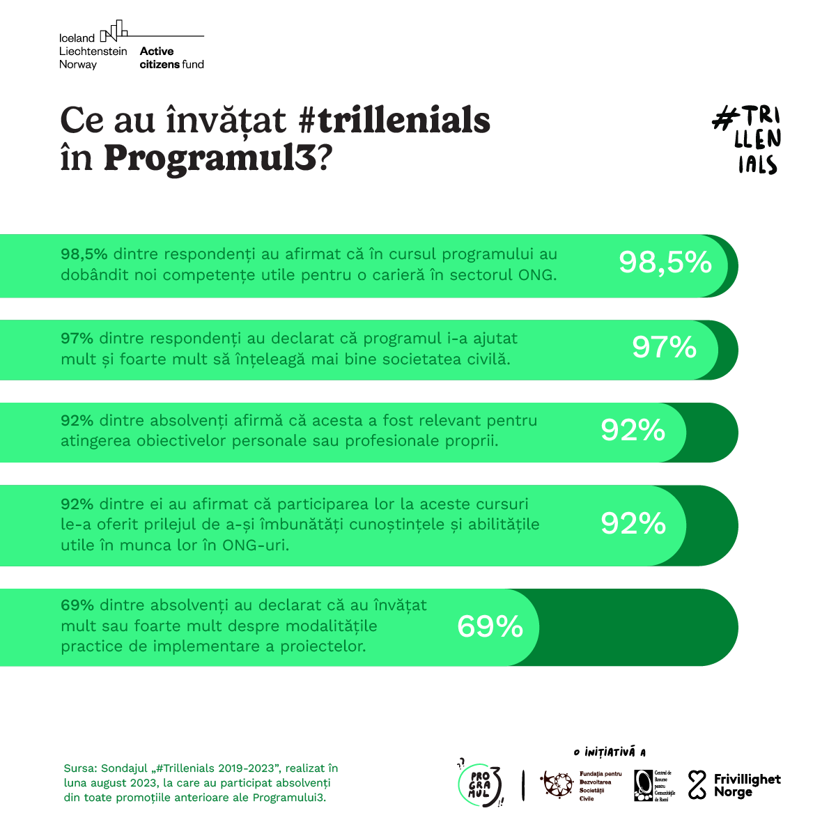 Astfel, aproape toți absolvenții Programului3 care au luat parte la sondajul realizat de FDSC (98,5% dintre respondenți) au afirmat că în cursul programului au dobândit noi cunoștințe și abilități utile, în timp ce 69% au declarat că prin intermediul acestui program au învățat mult sau foarte mult despre modalitățile practice de implementare a proiectelor. Printre abilitățile „soft” menționate de #trilleniali se numără, de exemplu, lucrul în echipă, capacitatea de a empatiza sau conștientizarea propriilor nevoi.