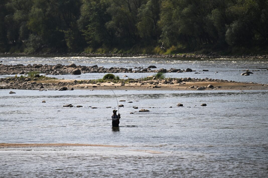 Un bărbat pescuiește în fluviul Vistula din Varșovia, afectat de secetă, pe 6 septembrie 2024. Potrivit hidrologilor, nivelul apei a atins un minim istoric de 25 de centimetri din cauza lipsei de precipitații semnificative și a temperaturilor ridicate. Foto: Sergei GAPON / AFP / Profimedia