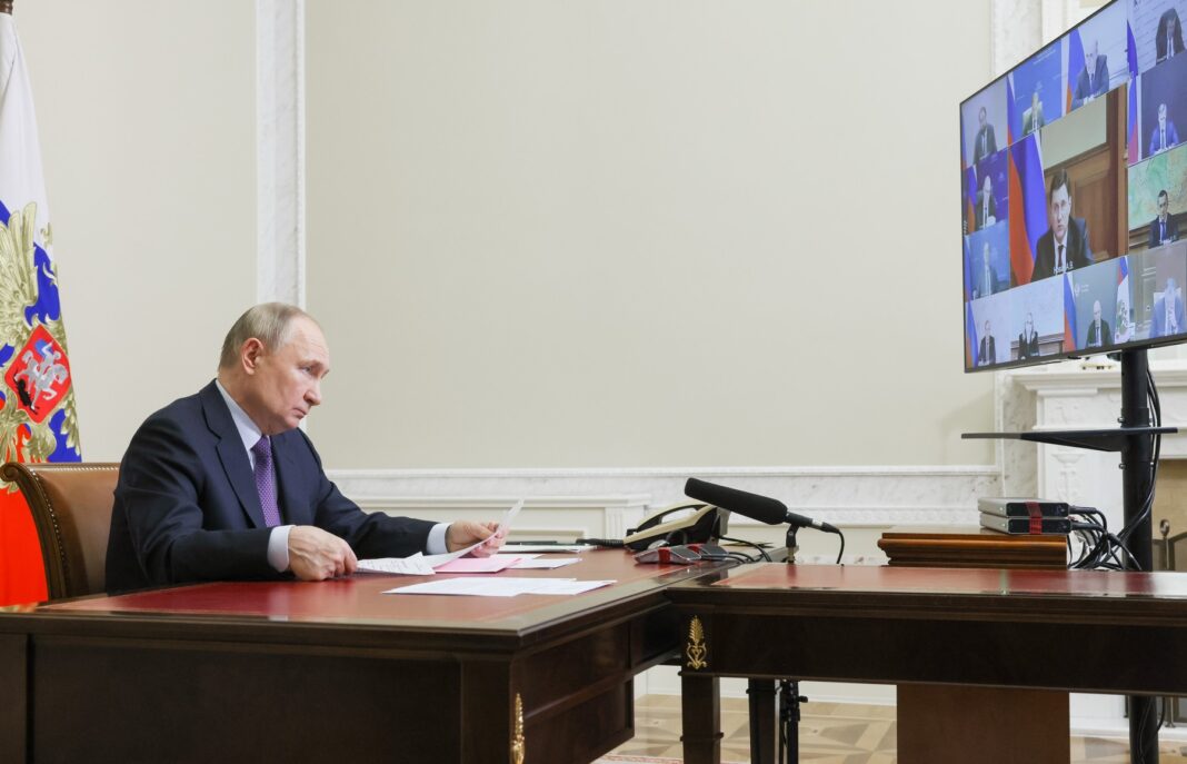 Președintele Rusiei, Vladimir Putin, are o întâlnire prin videoconferință cu membrii guvernului rus. Sankt Petersburg, 18 februarie 2025.