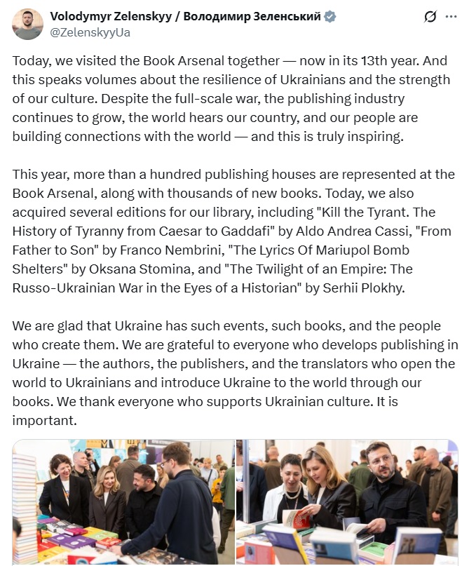 În una dintre fotografiile publicate poate fi observată prima doamnă a Ucrainei, Olena Zelenska, răsfoind un exemplar al cărții, în timp ce soțul său stătea lângă ea. Volodimir Zelenski a spus că este doar una dintre numeroasele cărți pe care el și soția sa le-au luat de la târgul din Kiev.